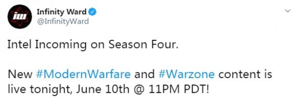 Infinity Ward官推公布《使命召唤16:现代战争》及其《使命召唤16:战区》第四賽季将于中国北京时间6月11日中午二点在PS4、Xbox One与PC上发布。