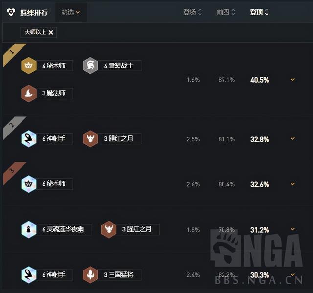而在当今版本号高手之上登上排名中,赢率最大的是4秘4重3法阵容。